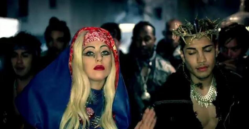 Gaga abrazando a “Jesús” que tiene una corona de espinas de oro, justamente jesús, que fue una de las personas más humildes jamás usaría algo de oro, lujos y demás, ¿es esto una burla?