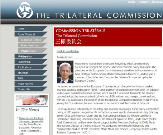 Monti fue electo Presidente de la Comisión Trilateral Europea en 2010. Para los no iniciados, la Comisión Trilateral es una importante organización mundial que reúne a la elite de EE.UU, Europa y Japón. Fue fundada en 1973 por el Caballero de Malta David Rockefeller y el Masón [NdE: Educado por los Jesuitas] Zbigniew Brzezinski (Bilderberg, CFR). Parece que la Comisión Trilateral ha estado luchando durante décadas para la reducción de la democracia y el establecimiento de un gobierno mundial.