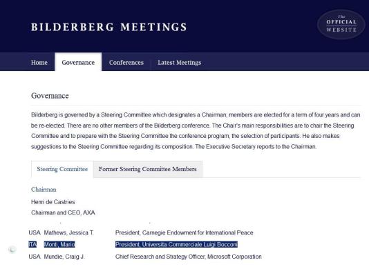 Mario Monti forma parte del Comité de Dirección del Grupo Bilderberg, otro grupo global, cuyas reuniones son confidenciales, este grupo también trabaja para un gobierno mundial. El Grupo de Bilderberg fue fundado por el jesuita Joseph Retinger y el príncipe Bernhard de los Países Bajos, un funcionario nazi de las SS y Caballero de Malta al servicio del Vaticano-Jesuita.