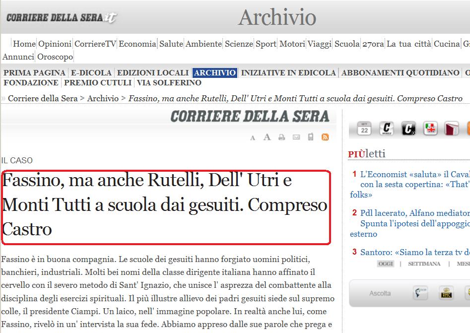 Este artículo se encuentra rodeado por la propaganda habitual que sirve para distraer la atención y la comprensión, para sentirse bien desconociendo los verdaderos objetivos de la educación jesuita (la hipocresía jesuítica se expresa en frases como: «Fuerte es el reclamo de los problemas de las minorías – dice el padre Bartolomeo Sorge S.J.».), en ellos encontramos, entre otros, los nombres de Carlo Azeglio Ciampi (ex director del Banco de Italia y ex presidente de la República), Francesco Rutelli, Marcello Dell’Utri, Giuseppe De Rita, Piero Fassino, Gianni De Gennaro, Luca di Montezemolo [NdeE: Alto Cab. de Malta en Argentina, Jefe de Ferrari, Fiat], Luigi Abete, Massimo Moratti, Leoluca Orlando, Gabriele Albertini, y también, Mario Monti. Así que vemos que los jesuitas han educado a todo el espectro político italiano de izquierda y de derecha. Algunos nombres han sido mencionados ya en el post anterior, otros no. El artículo también cita a Castro: «Nadie sospecha que Fidel Castro es un producto de la escuela [primaria y] secundaria jesuita de Belén en ‘La Habana’. Bueno, en «nwo-truthresearch» nos dimos cuenta hace un buen rato.