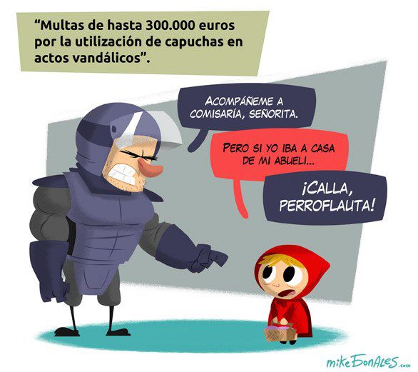 Aportamos un poco de humor, ante el ya tan evidente y flagrante Estado fascistoide español parapetado tras la palabra democracia en el que se recortan derechos sociales y libertades hasta el punto de lanzar nuevas leyes en las que se multará al ciudadano por llevar puesta una capucha o incluso la tan popular máscara de anonymous.