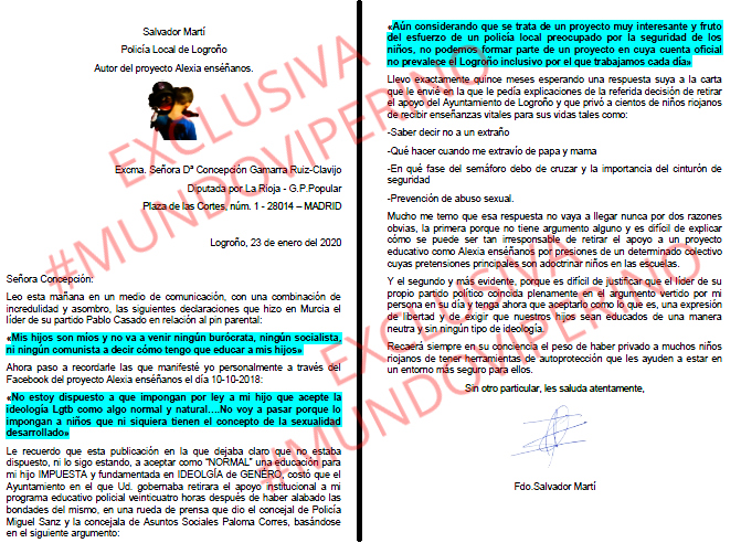 El señor Martí continúa explicándonos los siguientes pasos de su lucha: “Todo esto me he encontrado ahora. Que en su día Cuca Gamarra defenestre el proyecto Alexia y se posicione a favor del colectivo LGTB y el PSOE y el resto de grupos hicieran una piña para machacar a ‘Alexia Enséñanos’ y ahora, ¡oh magia! Pablo Casado dice que el Pin Parental es necesario. Voy a llevar esa carta al Congreso, dirigida a la diputada del PP Cuca Gamarra, añadiéndole que en su día ya le envié una misiva diciéndole que su actitud era incomprensiva y que estaba privando a muchos niños de Logroño de recibir un curso de prevención de abuso sexual y otras cosas de igual importancia por, simplemente, contentar al colectivo LGTB, y que no todo valía por votos. Hice la carta, pero ya te puedes imaginar qué se limpiaron con ella”.