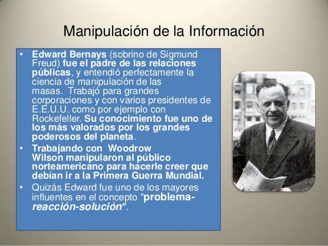 Edward Bernays, de familia judía, fue sobrino del padre del psicoanálisis, Sigmund Freud, además de descendiente directo del gran rabino de Hamburgo, Isaac Bernays.  Edward, emigró con su familia siendo aún niño, a principios de siglo XX, de Europa a EEUU donde desarrolló un vil programa de manipulación mental para el control de las masas mediante el lavado de cerebro empleando las técnicas de psicoanálisis desarrolladas por su tío Freud. Bernays fue el creador de la propaganda (véase su libro titulado PROPAGANDA) que aplicó en todos los ámbitos imaginables de la sociedad, la misma estrategia que empleó después Joseph Goebbels, ministro de propaganda Nazi. Posteriormente, Bernays cambio el nombre a sus oscuras técnicas de manipulación colectiva maquillándolo con un término más amigable creando así las «Relaciones Públicas«.